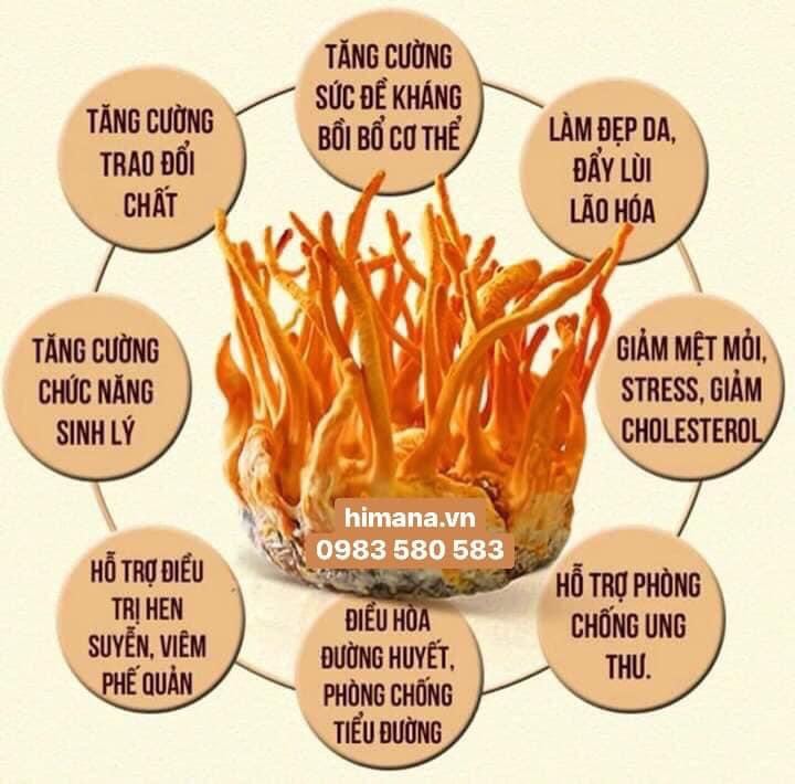 Đông trùng hạ thảo: Nổi tiếng với khả năng tăng cường hệ miễn dịch, bồi bổ khí huyết, cải thiện chức năng sinh lý..